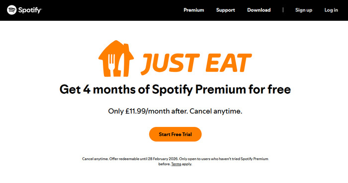 Just Eat is offering a promotion for customers who haven't yet tried Spotify Premium. New eligible users can claim up to 4 months of free Spotify Premium. To get this offer, you can earn points with each order and then redeem a Spotify Premium voucher for 30 points.